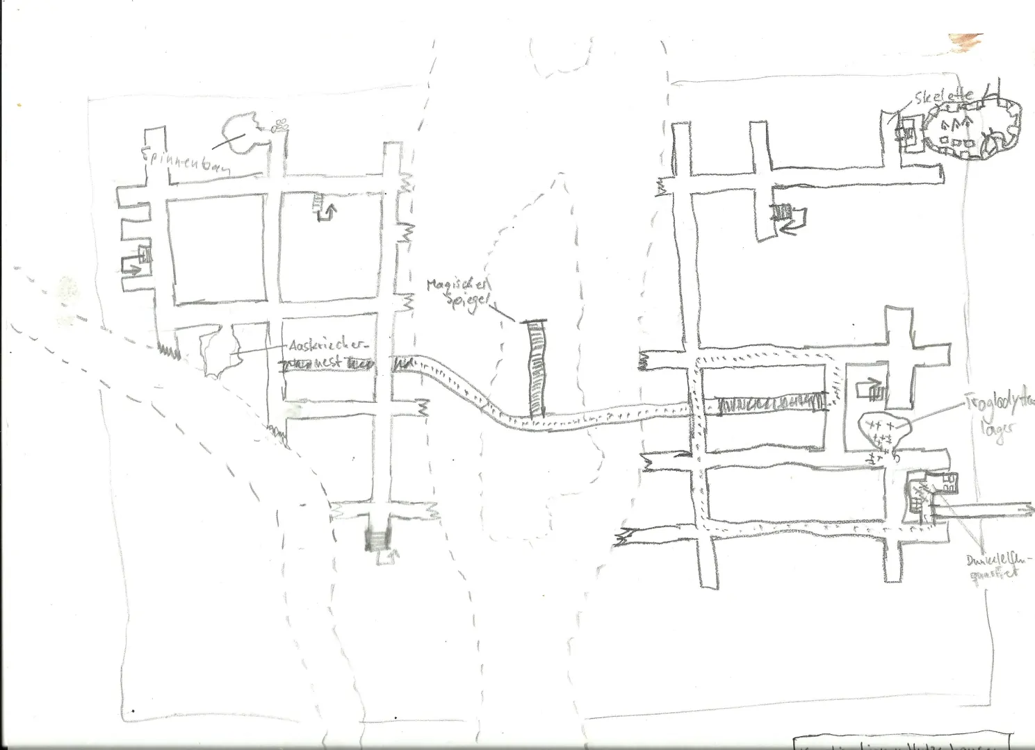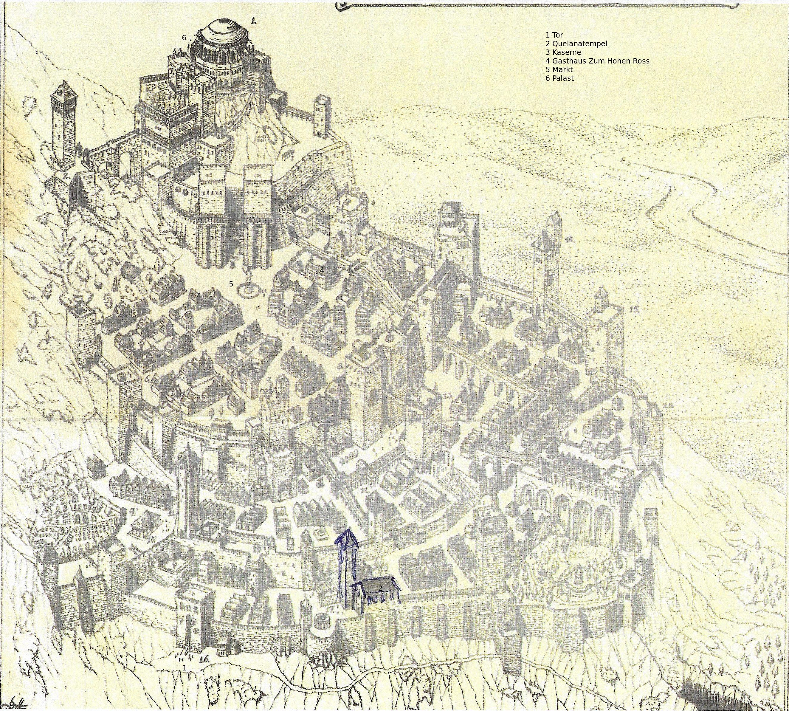 Später bekommt er die Gelegenheit, ein paar seiner Ingredienzien aufzustocken, und in der Bibliothek zu schmökern, wo er bald den Zauber »Entkräftung« entdeckt und in sein Buch überträgt. Hedammu blättert ebenfalls in Schriften, die von Renatus, dem Gründer der Ritter des Rechts fabulieren, wie er im Bauch von Paula geweilt und sich darin eine Hütte aus Treibholz gebaut haben soll. Doch wie so viele vor und nach ihm sei er wieder ausgespien worden. Unterdessen erwacht Grandolf aus seiner narzisstischen Episode, steckt den Spiegel ein, geht einen Schnaps trinken und vertut sich in der Alchemistenstube. Die Früchte seiner Experimente sind ein Rauchstab, ein Verstrickungsbeutel, Gegengift und Säurephiolen.
