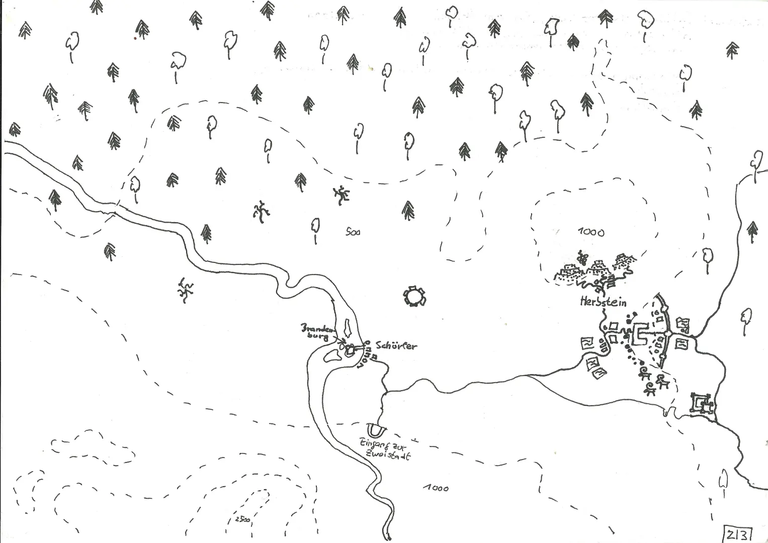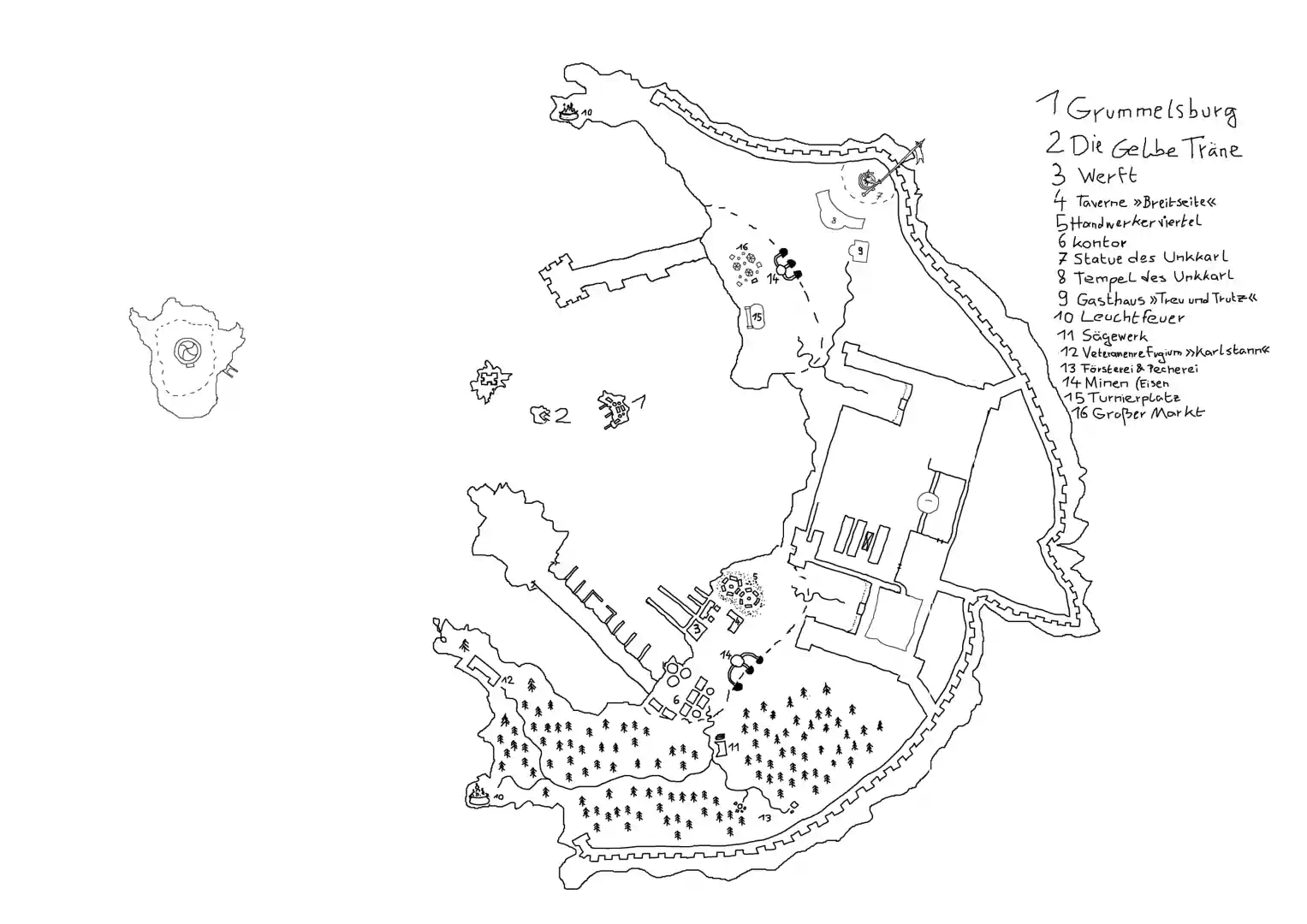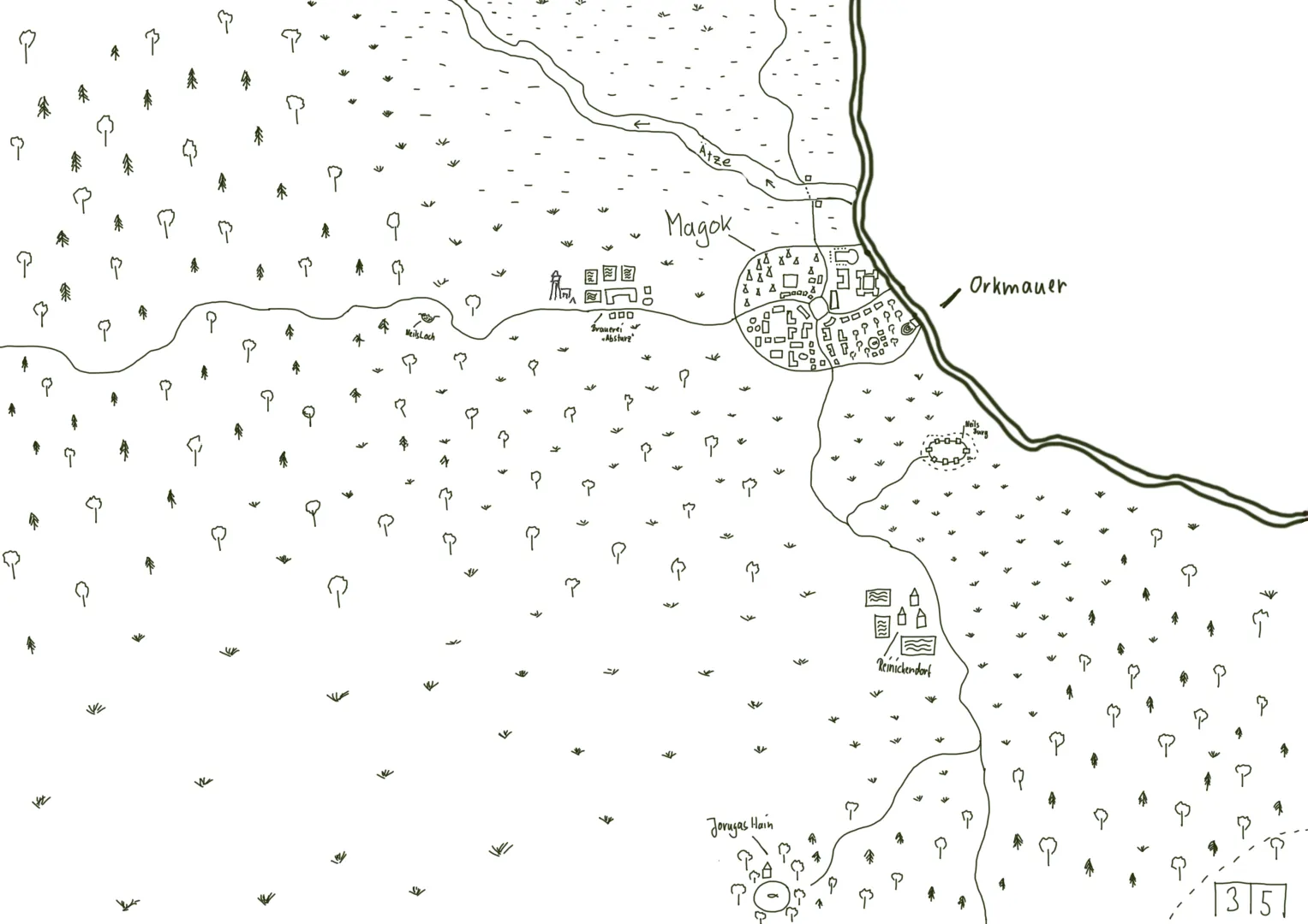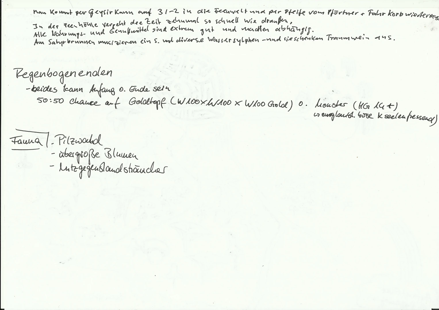 Hans will derweil den Vorrat, besser noch die Anfertigung von magischen Schriftrollen auf der Insel ankurbeln und sucht den Schriftführer auf. Der kann nach wie vor nur mit Restposten einfachster Zauberpergamente dienen, verrät aber, dass zwei Gestalten, die ihm Fröhlichen Horn weilen, nach Hans gefragt hätten.