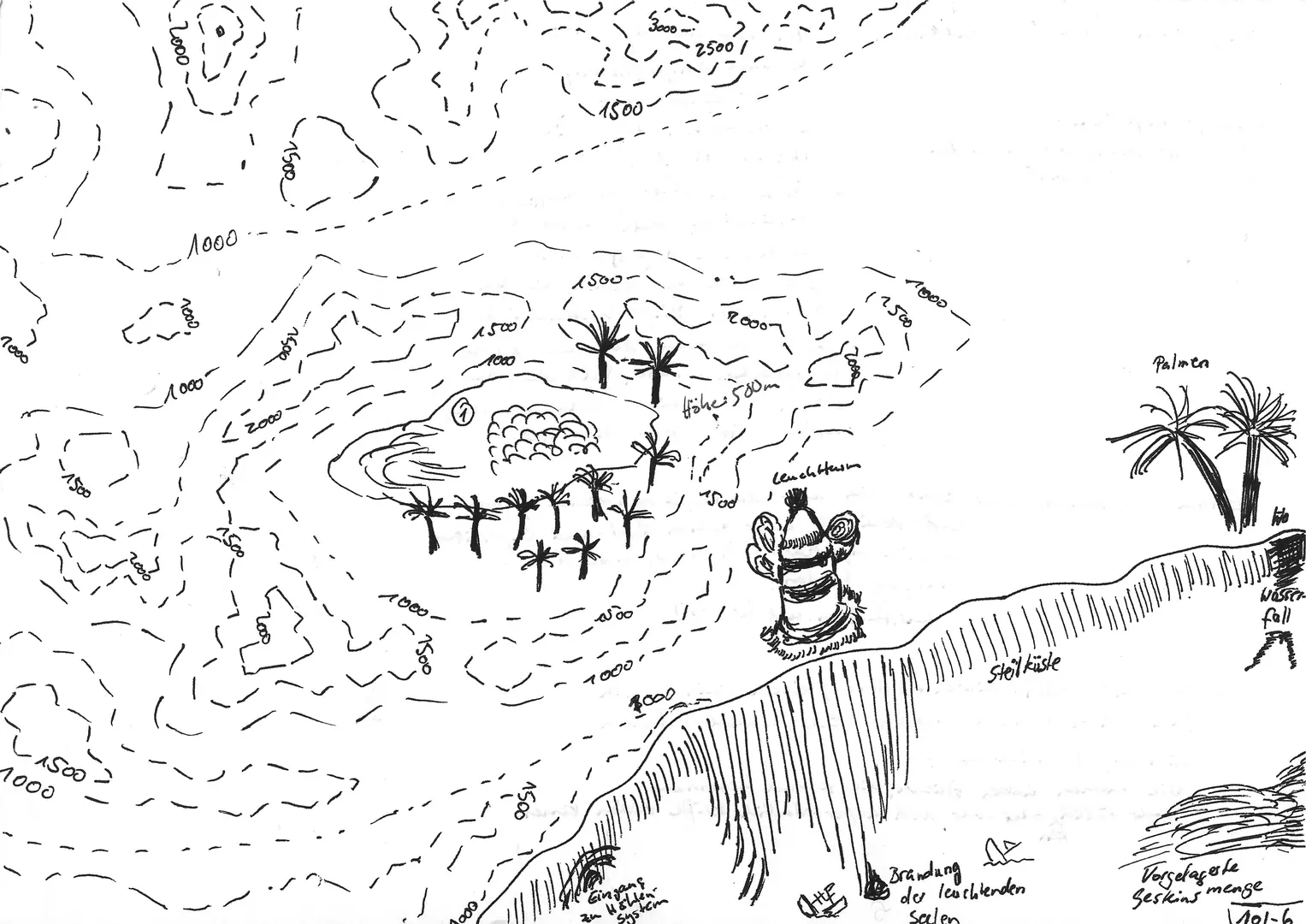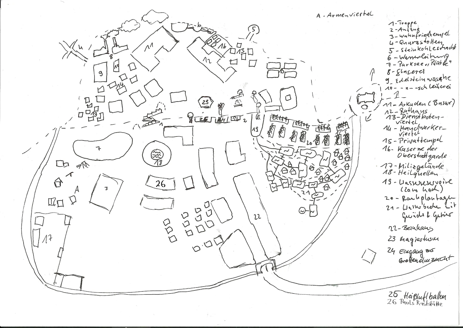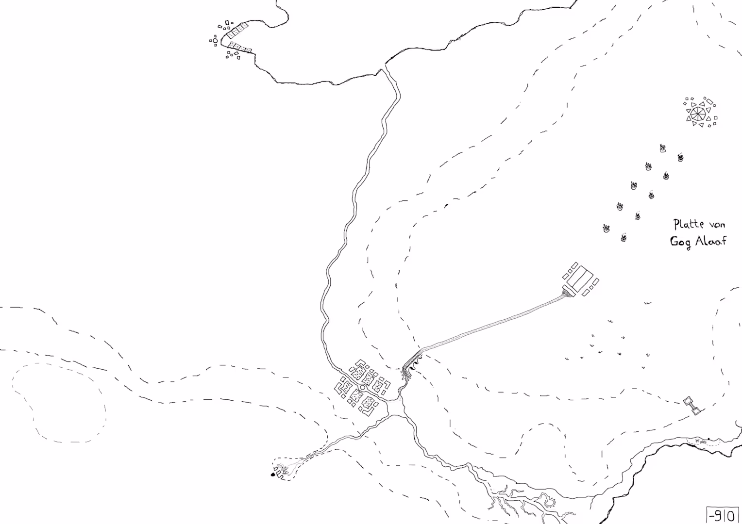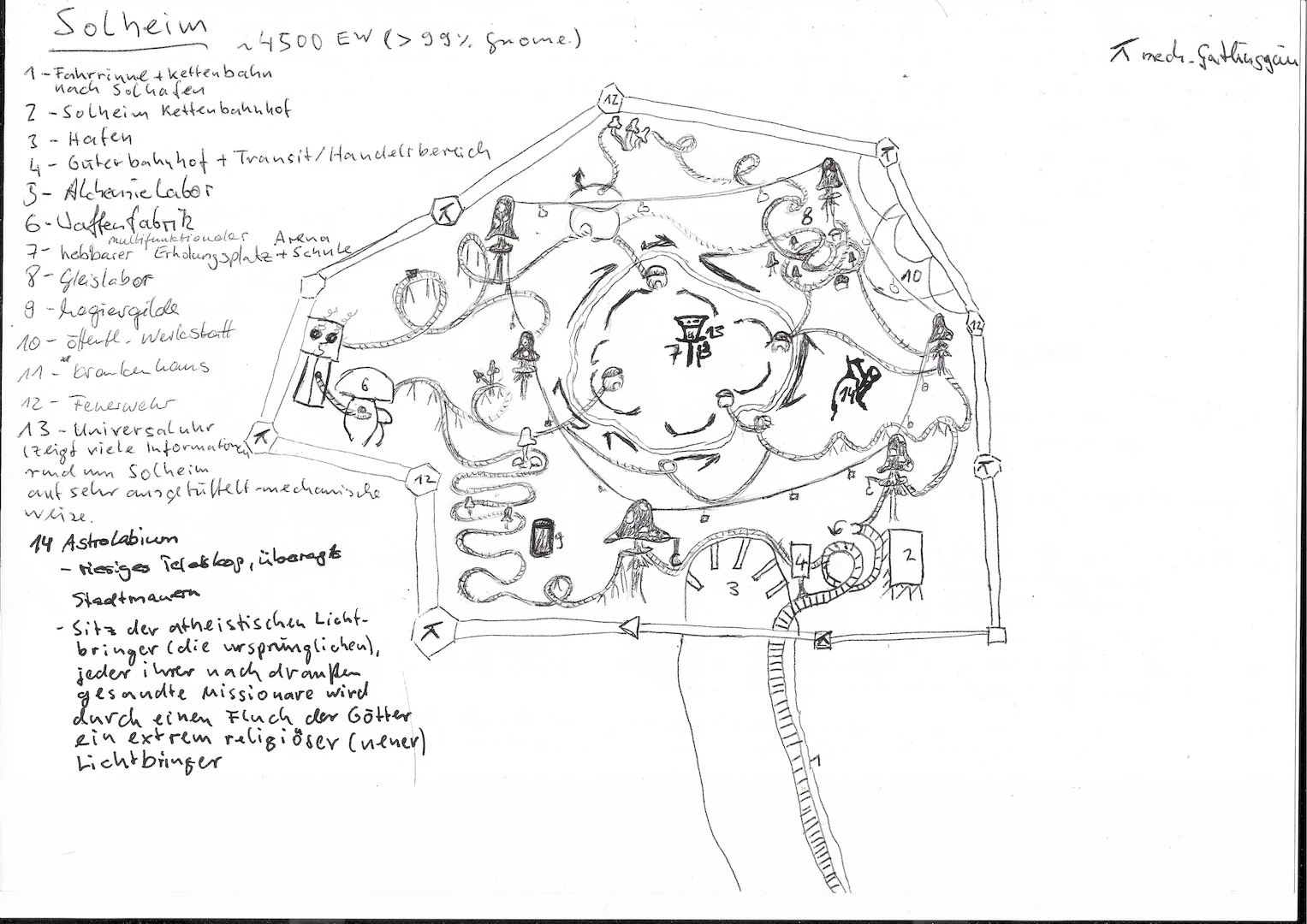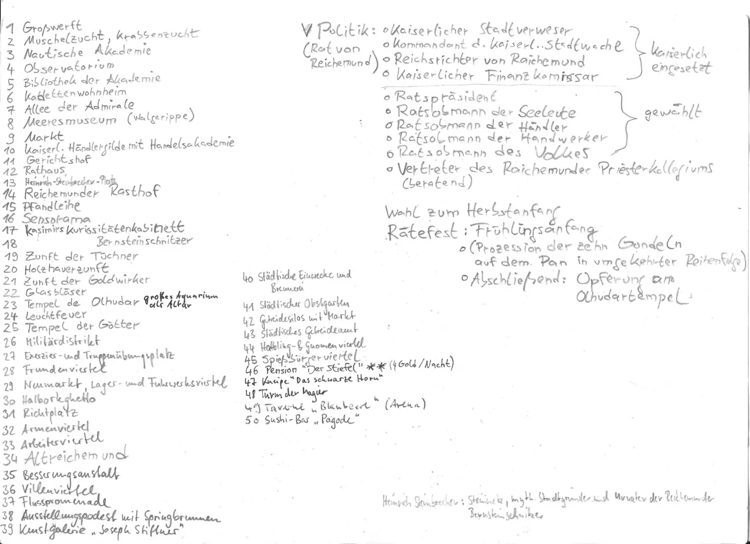 - Darin ein Zettel, kunstvoll kaligraphiert: Von Rodrigo an Mateo, über das Verschwinden des Walfängerstaates Arabatis, Werk des zwergischen Nestor-Ordens, ein Portal dahin, das mit drei Zahnrädern geöffnet werden könne, und schließlich verschlüsselte Informationen, für die Mateo das Dechiffriergerät besäße