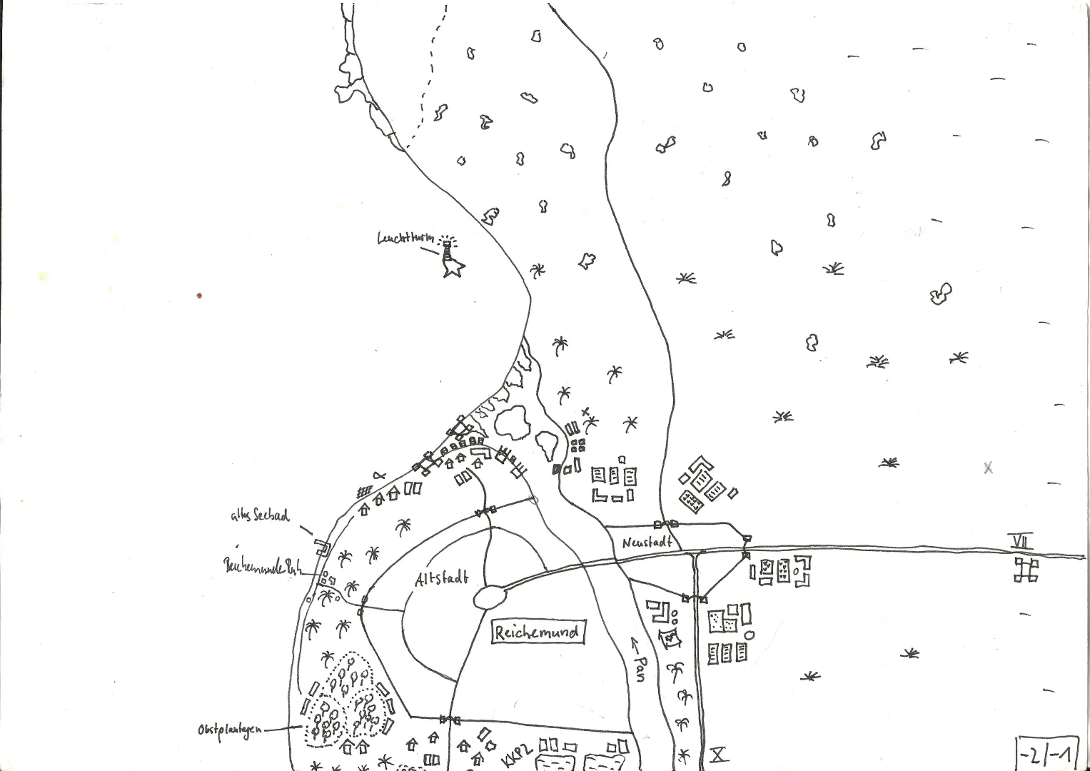 Kurz darauf sieht er die Lange Renate im Hafen einlaufen. Man tauscht das zwischenzeitlich Erlebte aus; Gex bemerkt die Anmut und Stärke seiner Neubekanntschaft und schmiert ihm geschickt Honig ums Maul. Unter den Gefangenen, die sich sicher gut in die Schar der Handlanger und -werker Hornungs integrieren lassen, ist Grandolf mit seinem überaus kauzigen Zungenschlag der Auffälligste. Er verspricht, mit seinen explosiven Künsten eine große Bereicherung für die Insel zu werden. So wird er mit ins Fröhliche Horn geladen, als der Fette Toni die Abenteurer am Hafen aufliest. Zwei weitere Trophäen sollen das Etablissement zieren: Das Bannamulett aus dem Wasserträgertempel und Mimis schlecht geschnitzter Aurumvoraxknochenwürfel.