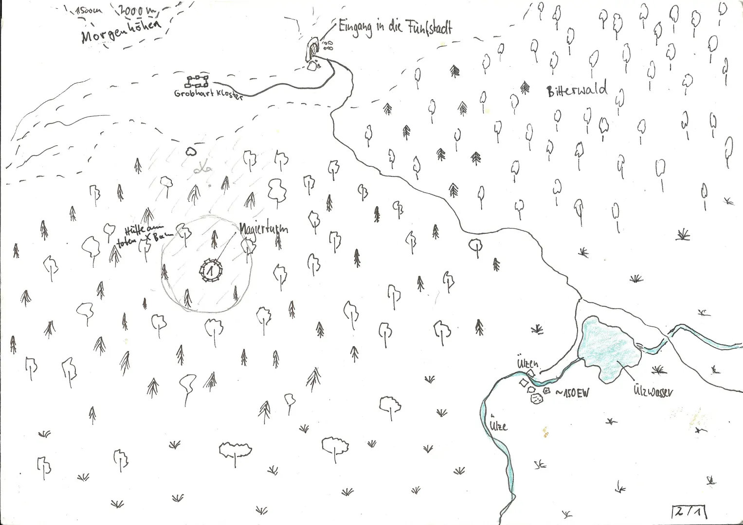 Während Hans in der Reethütte sein Grimoire um einen Zauber erweitert, berichtet Hedammu Gex im Fröhlichen Horn von seiner Bekanntschaft mit Lisel. Grandolf holt eine Räucherkerze, eine »Karzl« hervor und lässt sie zu Ehren Ernas schwelen. Er hatte sich als Karzlmacher verdingt, was auf Dauer zu fad war. Gex erschafft ein geisterhaftes Geräusch aus Richtung der Kerze, was insbesondere Grandolf verdutzt. Das Geräusch wird stetig lauter, bis es in einem heftigen Zischen endet, das einen Großteil der Gäste aus dem Fröhlichen Horn verjagt.